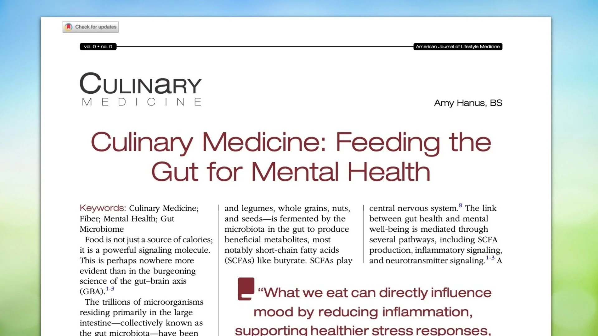 This article, authored by Full Plate Living Program Director, Amy Hanus, emphasizes how clinicians can utilize dietary interventions to improve patient well-being and mental health outcomes.