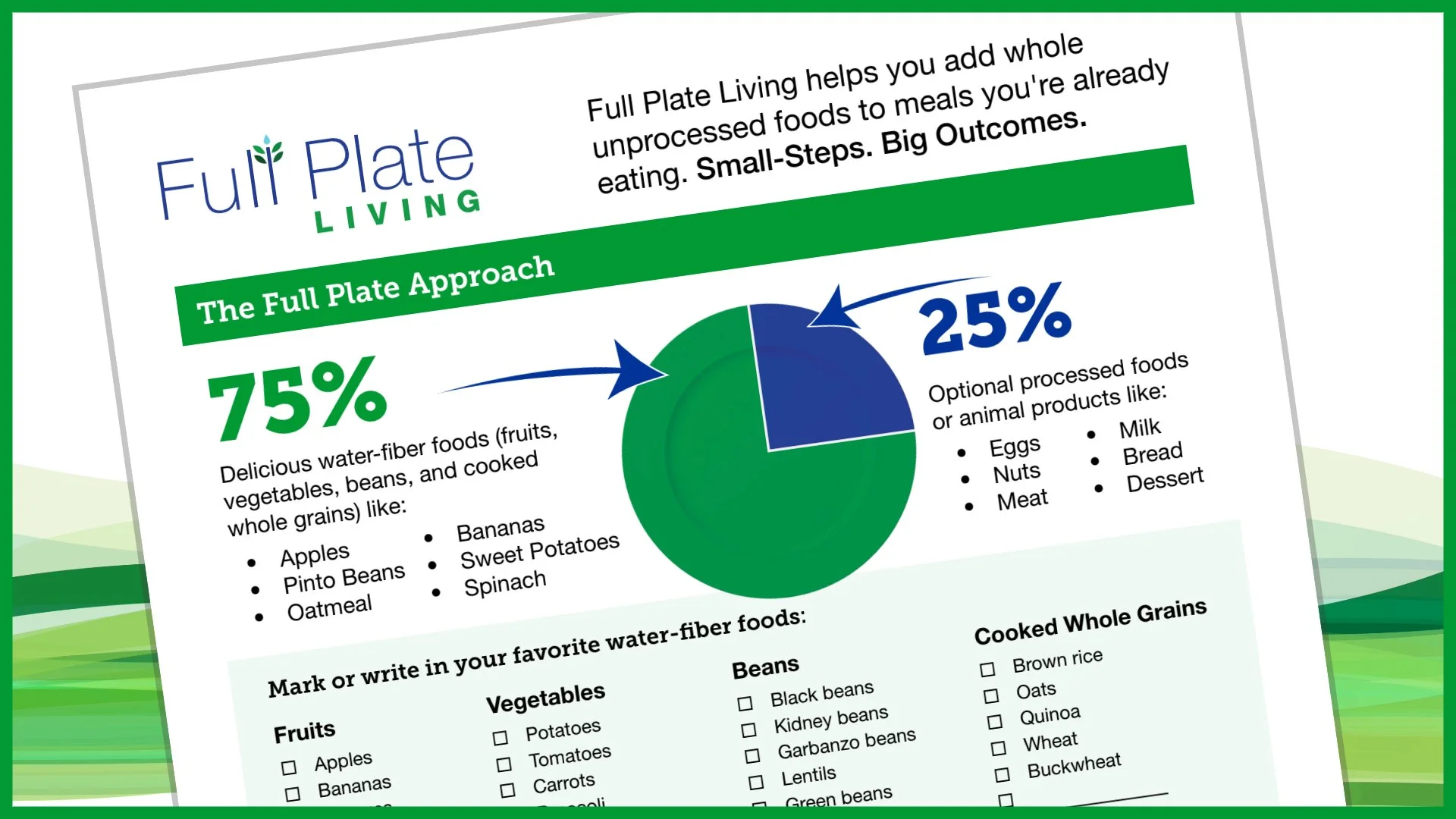 Full Plate Living is a research-based nutrition program offered free of cost by AIH. Full Plate Living uses small-step behavior change to help people add more whole, unprocessed fiber foods to their meals, promoting sustainable lifestyle changes. Support your patients by referring them to the Online Program or hosting a Shared Medical Appointment Program. We provide all the materials needed to integrate Full Plate Living into your practice, including a Facilitator Training and CME.